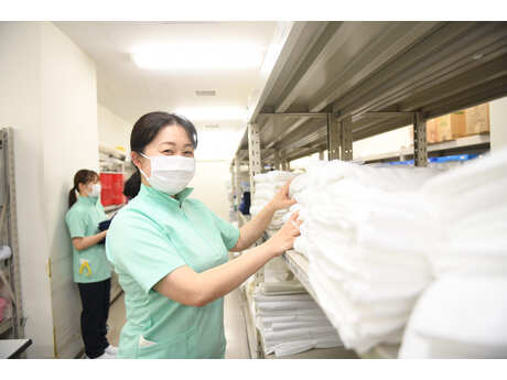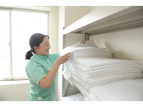 病院内で患者様や病院のスタッフさんが使用する、シーツや枕カバー・制服・カーテン・パジャマなどの交換を行なったり、病院内の清掃、食事の配膳など、快適な療養・職場環境づくりのお手伝いをしています。